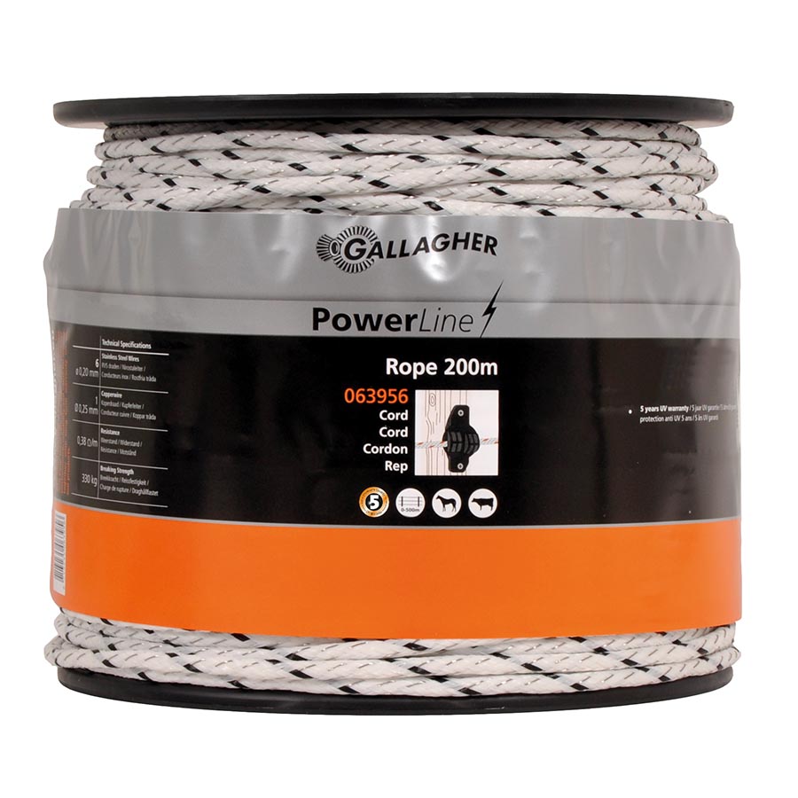Gevlochten kunststofkoord voor (semi-)permanente paarden- en vee-afrasteringen. Een uitstekende geleider dankzij 5 roestvrijstalen draden en 1 vertinde koperdraad. Paard