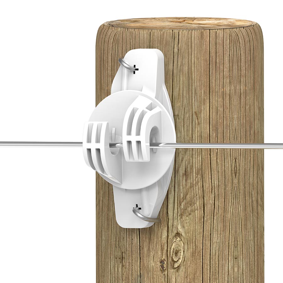Extra robuuste. zeer solide schroefisolator zonder ijzeren kern. waardoor kortsluiting onmogelijk is. Voor het toevoegen van draad op een houten afrasteringpaal. Paard