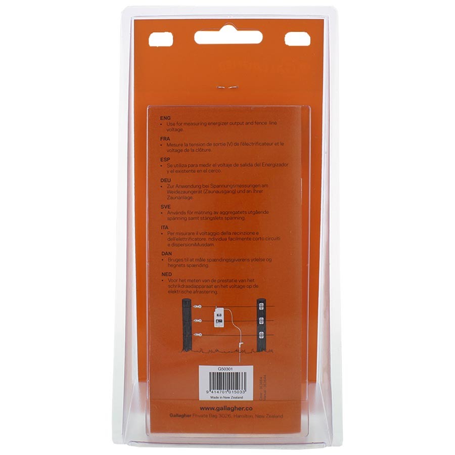 Informeert u exact over de conditie van uw afrastering. Meet het voltage op de elektrische afrastering. Werkt gedurende 6 tot 12 maanden op één 9V batterij. Het meetbereik ligt tussen 100V en 12kV. 0
