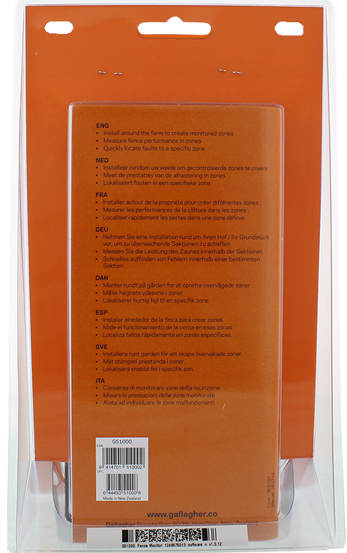 Biedt de mogelijkheid om een aparte zone van de afrastering in de gaten te houden. De afrastering monitor communiceert via de geleider met het schrikdraadapparaat en zal u waarschuwen als de waarden van die zone lager zijn dan de vooraf ingestelde waarden. Op de M1800i en M2800i kunnen in totaal 6 afrastering monitoren aangesloten worden. 0