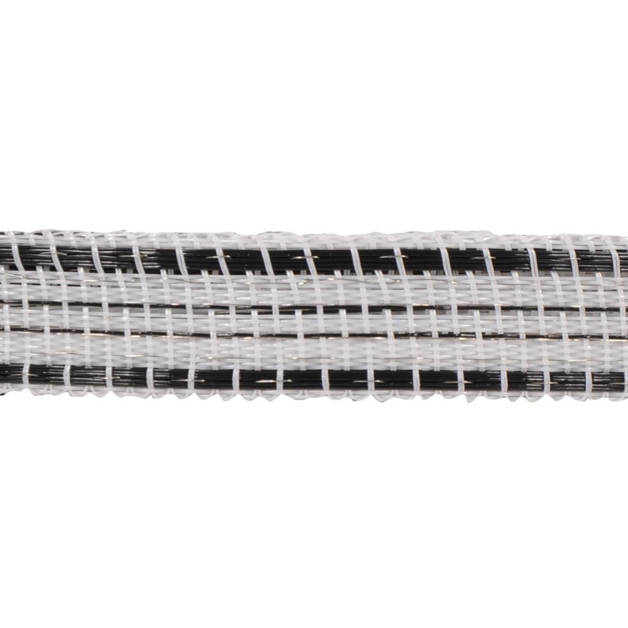 Goed zichtbaar lint met een zwarte kantdraad ter versterking en met 5 dikke roestvrijstalen draden en 1 lichtmetalen draad voor een uitstekende geleiding. Geschikt voor tijdelijke paardenafrasteringen. Paard