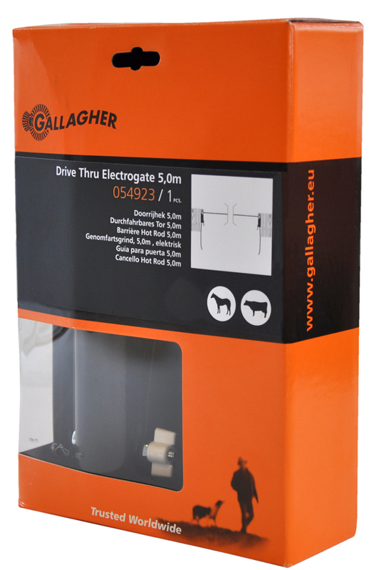 Een compleet hek. eenvoudig mee te nemen en op te hangen op plaatsen waar u vaak door een hek moet rijden. De trekker duwt het hek. dat onder spanning staat. zelf open en het sluit automatisch. Paard
