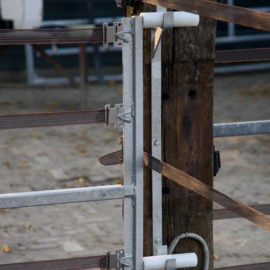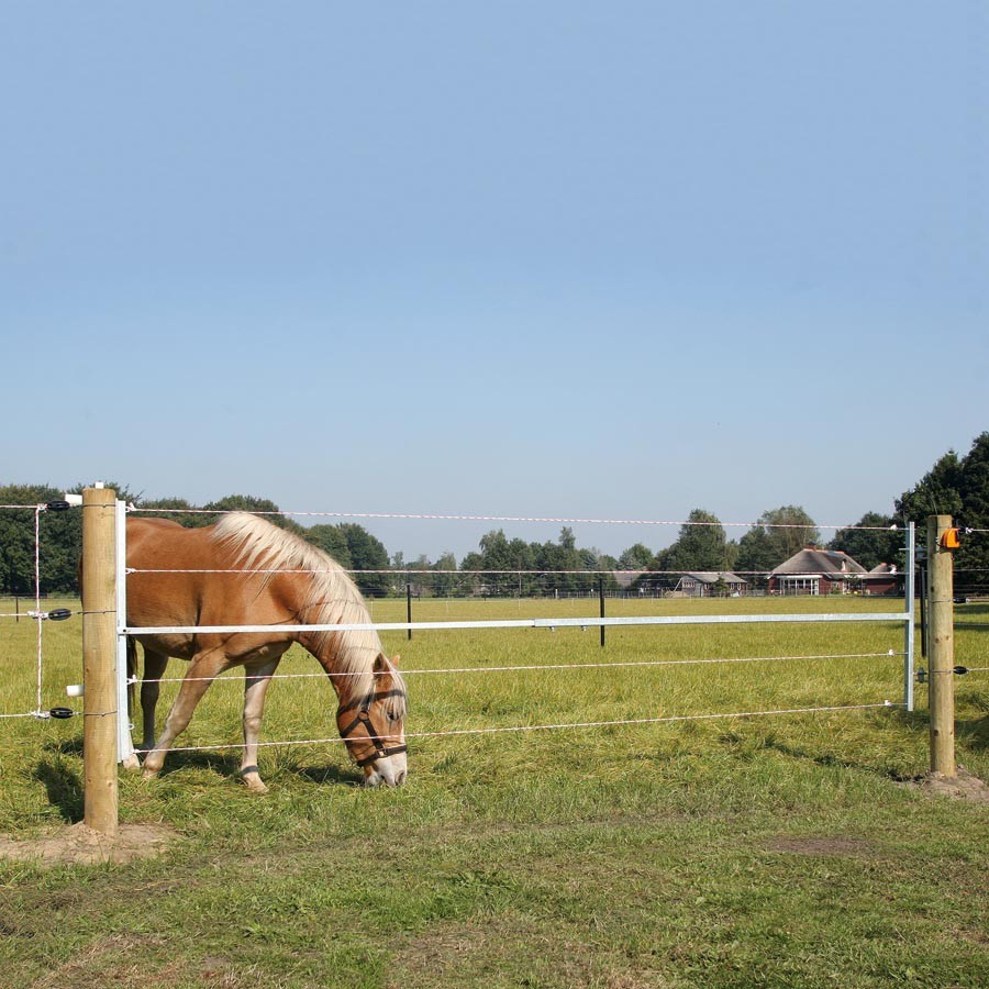 Zeer doeltreffend. onderhoudsvrij en verstelbaar elektrisch hek. Gegarandeerde lange levensduur. Geschikt voor al uw permanente elektrische afrasteringen. Geleverd zonder gegalvaniseerde draden. U kunt naar wens ook lint in het hek spannen. Afmeting: 2.5m breed x 1m hoog. tot max. 4.5m uit te schuiven. Paard