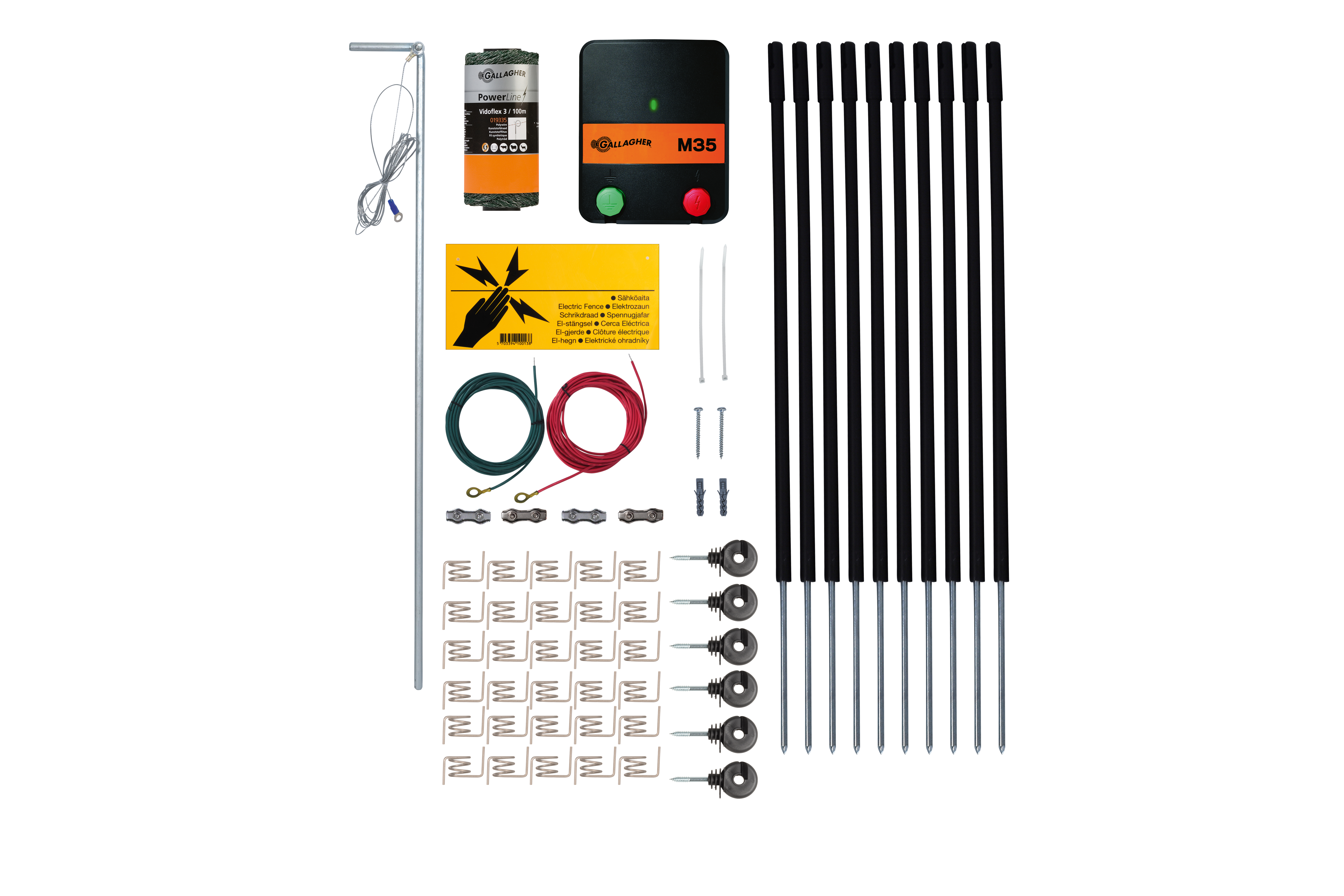 Een ideale set om uw huisdieren binnen uw eigen tuin te houden of juist om huisdieren van buren te weren uit uw tuin. De M35 is een compact maar krachtig schrikdraadapparaat dat werkt op lichtnet. De afrastringspalen hebben een hoogte van 50 cm. Deze kit bestaat uit: M35 (schrikdraadapparaat). 100 m kunststofdraad. 4 draadverbinders. 10 (zwarte) afrasteringspalen van 50 cm. 30 draadclips. 6 schroefisolatoren. 1 aansluit set. 1 aardpen. 1 waarschuwingsbordje (incl. bevestigingsmateriaal). 1 montageset en een handleiding