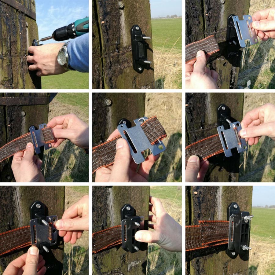 Hoekisolator van hoogwaardig kunststof die het lint vastklemt tussen 2 losse rubberen delen (gepatenteerd systeem) waardoor een lange levensduur is gewaarborgd. Gebruik het RVS verbindingsplaatje (art.nr. 010745) voor de begin- en eindhoekpaal. Paard