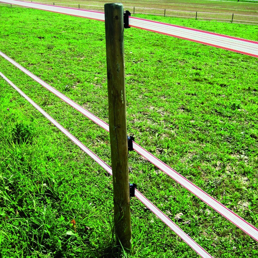 Zeer stevig TurboLine lint met versterkte rode randen. bestemd voor permanente paardenafrasteringen. De unieke samenstelling zorgt voor 40x betere geleiding dan het standaard 40mm lint. Met 10 dikke roestvrijstalen draden van 0.16 mm. 1 van 0.2mm en 4 lichtmetalen draden van 0.25mm. Paard