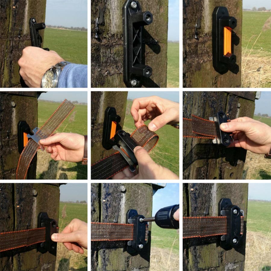 Deze innovatieve en robuuste hoekisolator heeft talloze voordelen ten opzichte van de traditionele lint-isolatoren zoals: Een uniek subframe voor optimale stevigheid en bevestiging aan de paal. Meegegoten rubbers voor optimale grip op het lint. Te bevestigen met 1 maat schroefbit. Unieke lip voor het spannen en herspannen van het lint. Het apart verkrijgbaar tussenplaatje (art.nr. 708027) is te gebruiken als verbinder en poortgreepanker. Paard